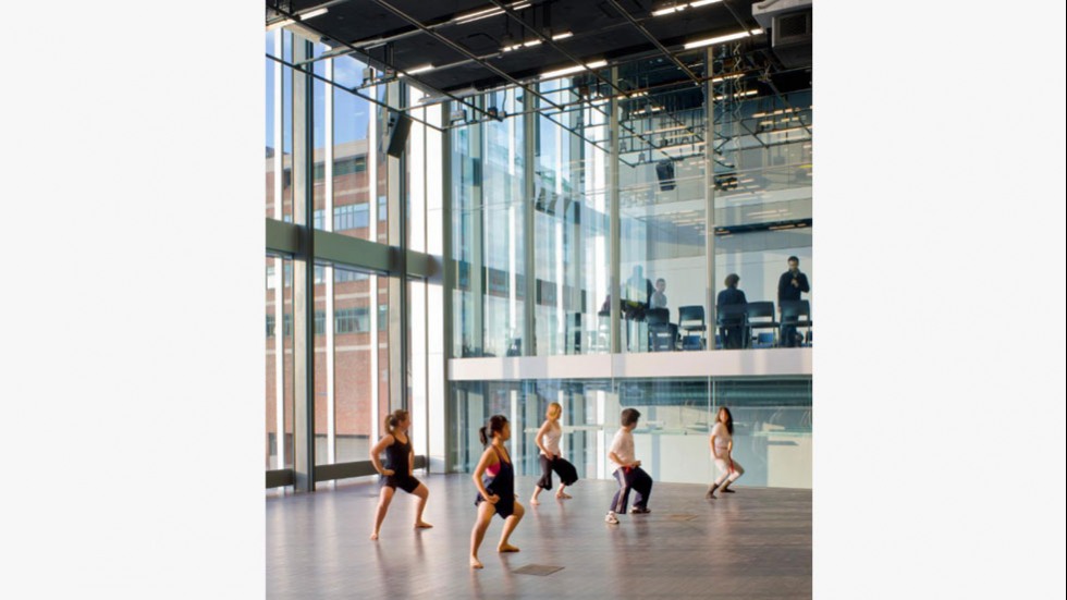 With a western façade made of glass and intentionally misaligned studios and classrooms, bisected by a glass seam so that students in one space can see into other classrooms, the striking building exudes a sense of openness. A central staircase flanked by lounges and exhibit areas encourages the building’s users to repeatedly encounter other people, projects and ideas.