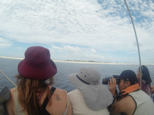 Standing on the starboard side of the quarterdeck looking at Enderbury, an uninhabited island. Baek has the binoculars.