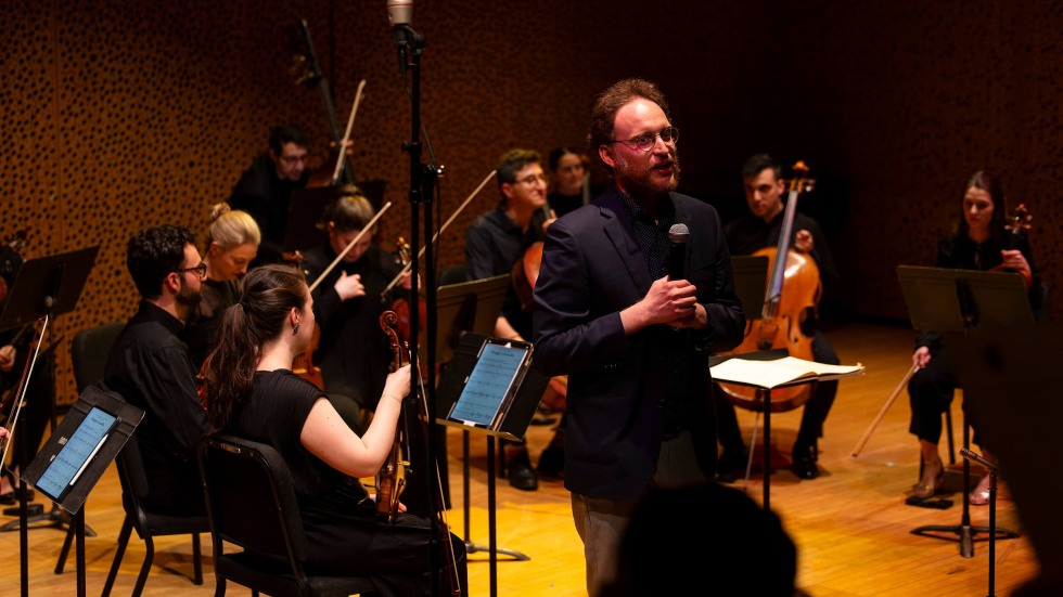 In April, the group rehearsed two of Nathan’s compositions, including his new work, “Double Concerto No. 2,” and did a talk-back session with students before performing a sold-out public concert at Grant Recital Hall. The concerto was co-commissioned by the New York Classical Players and the Providence-based Rhode Island Chamber Music Concerts in memory of the late violist Roger Tapping.